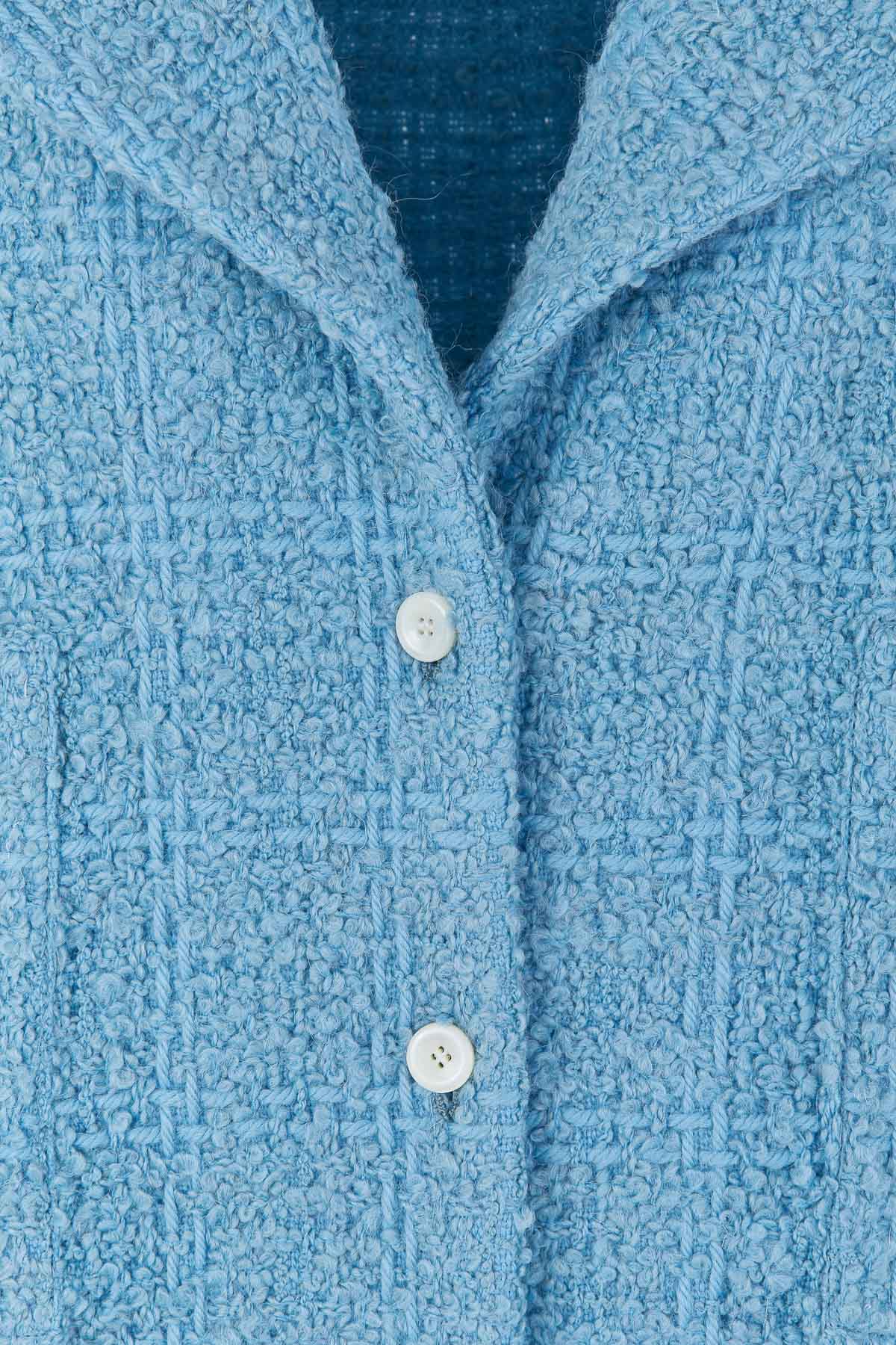 Our Meryl is a boxy overshirt cut in textured bouclé with a rich, cerulean tone. It features a soft notched collar, chest pockets, and buttoned cuffs. Unlined and easy to wear, it works both as a light jacket and a structured shirt, with enough texture to carry the whole look.